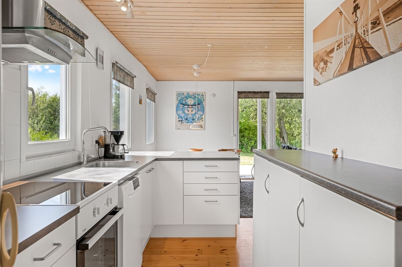 Sommerhuset er indrettet med nyt åbent køkken(2025) med opvaskemaskine, via køkken adgang til den lækre stue, hvor der er brændeovn og varmepumpe samt udgang til den overdækkede terrasse og haven, badeværelse med gulvvarme, 2 soveværelser med dobbeltsenge samt skabe og 1 soveværelse med 2 fritstående senge.