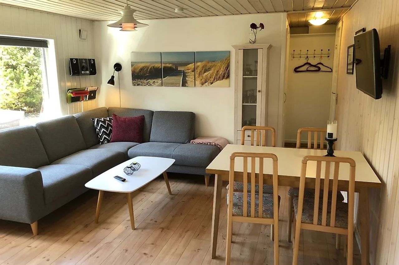 Fritidshuset rummer 55 m² boligareal i et plan og fremstår hyggeligt og funktionelt indrettet. Planløsningen er veludnyttet med et indbydende opholdsrum, der naturligt samler familie og gæster. Her er god plads til både spiseafdeling og sofaarrangement, og de store vinduespartier giver et fint lysindfald og kig til den omkringliggende natur. Huset er løbende moderniseret og vedligeholdt.