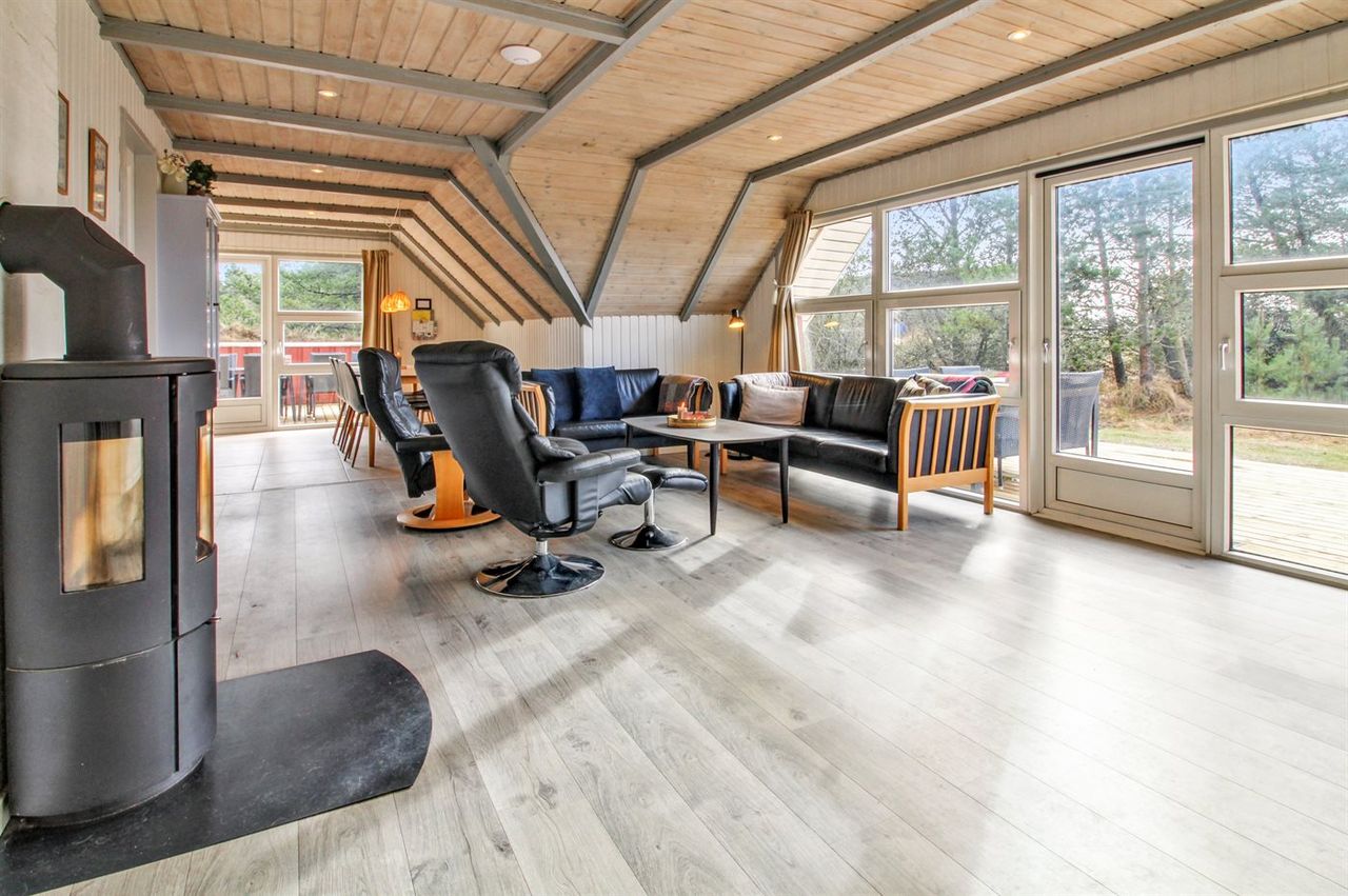 Huset er indrettet med bryggers, hvor der er vaskemaskine og tørretumbler, gæstetoilet med gulvvarme, stort badeværelse med sauna og gulvvarme, nydeligt åbent køkken med gulvvarme og spiseplads samt udgang til østvendt terrasse, pragtfuld stue med varmepumpe og brændeovn samt fantastisk udsigt over de flotteste marker med kuperede lyngarealer, 1 soveværelse med dobbeltseng, 1 soveværelse med dobbeltseng og tv, et soveværelse med køjesenge.