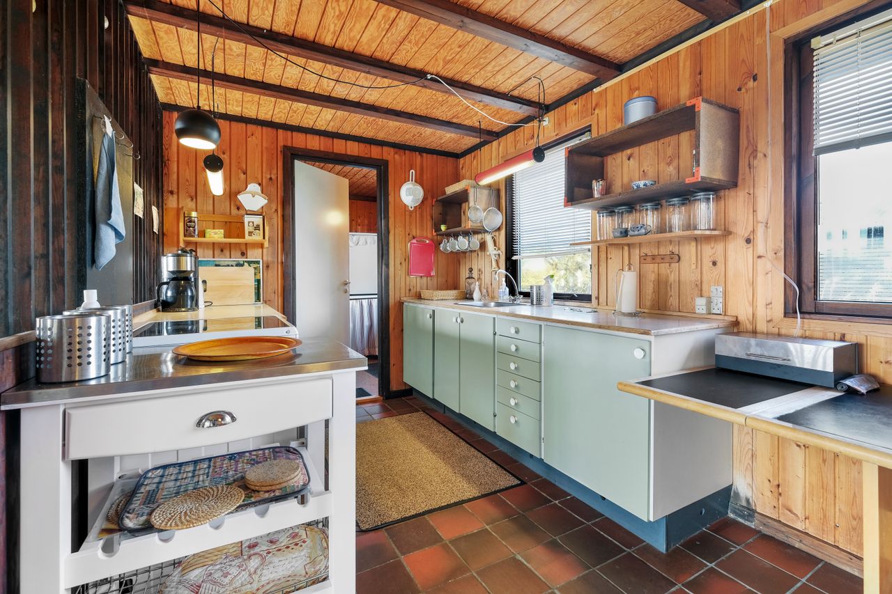 Huset er indrettet med entre', åbent køkken med adgang til dagligstue, hvor der er brændeovn, fra dagligstue adgang til stor spisestue med hems, badeværelse, soveværelse med dobbeltseng og skabe, 1 værelse med køjesenge og 1 værelse med 1 fritstående seng.
