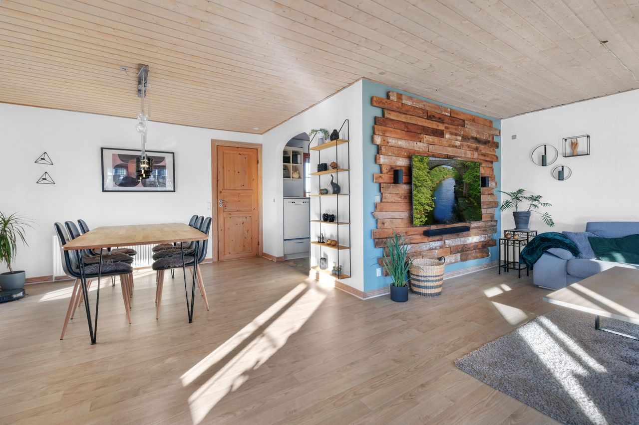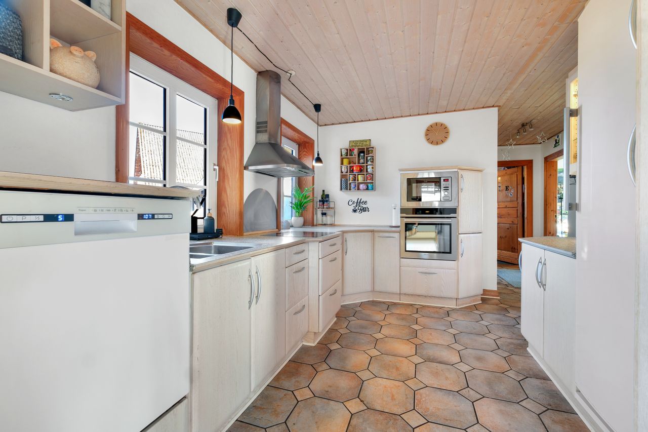 Huset er indrettet med et bryggers, hvor der er plads til vaskemaskine og tørretumbler, entre', nydeligt køkken med gulvvarme, flot stor stue med udgang til overdækket terrasse, gæstebadeværelse med gulvvarme, fordelingsgang med adgang til 4 soverum/værelser samt et badeværelse med gulvvarme. Via entre'en er der adgang til den udnyttede tagetage, hvor der forefindes 1 soverum samt et lille kontor og et stort u-udnyttet loftsrum.