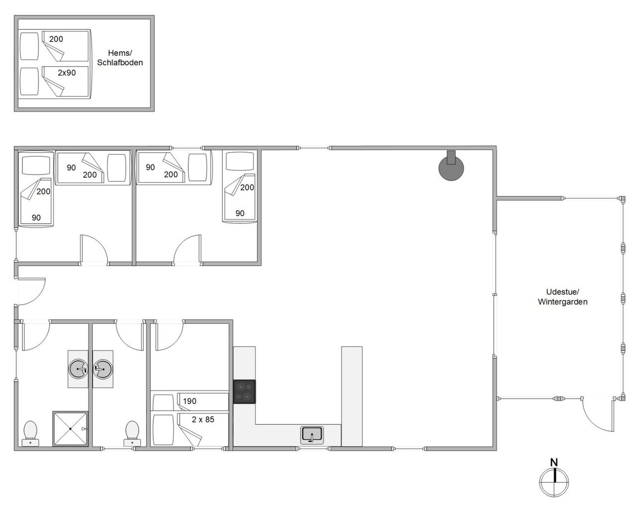 Huset er indrettet med fordelingsgang, flot åbent hyggeligt køkken med opvaskemaskine og spisekrog, pragtfuld stor stue med varmepumpe og brændeovn samt udgang til den flotte udestue. Flot badeværelse, 2 soveværelser med hver 2 fritstående senge samt et børneværelse med køjesenge og hems med 2 sovepladser, gæstetoilet med vaskemaskine.