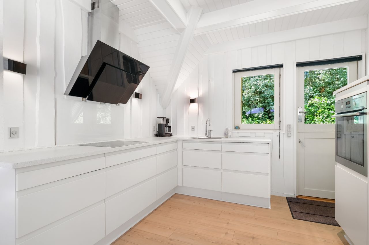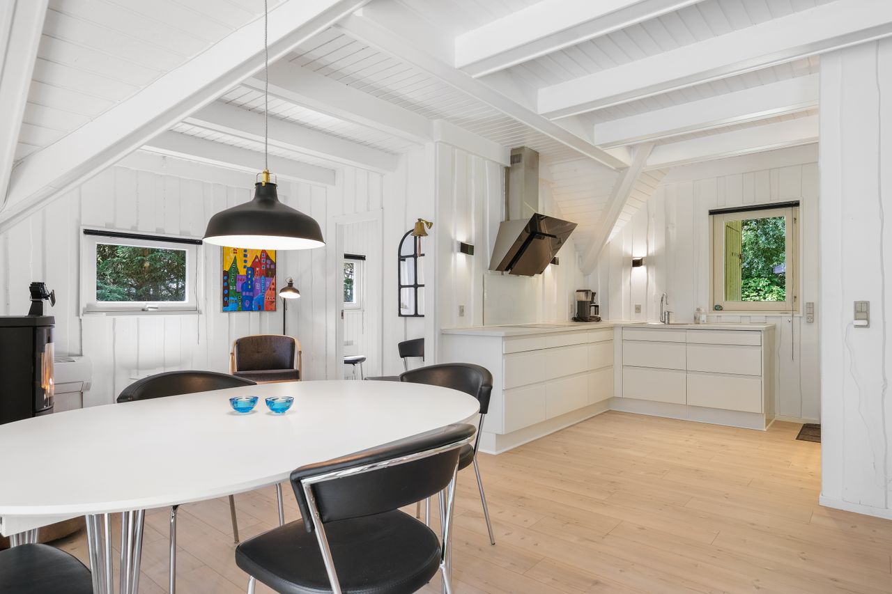 Husets indretning: Bryggers med vaskemaskine og tørretumbler, Flot åbent køkken-stue-miljø med brændeovn og varmepumpe - udgang fra stue til overdækket terrasse, nydeligt badeværelse med gulvvarme, 2 soveværelser med dobbeltsenge samt et soveværelse med 2 fritstående senge.