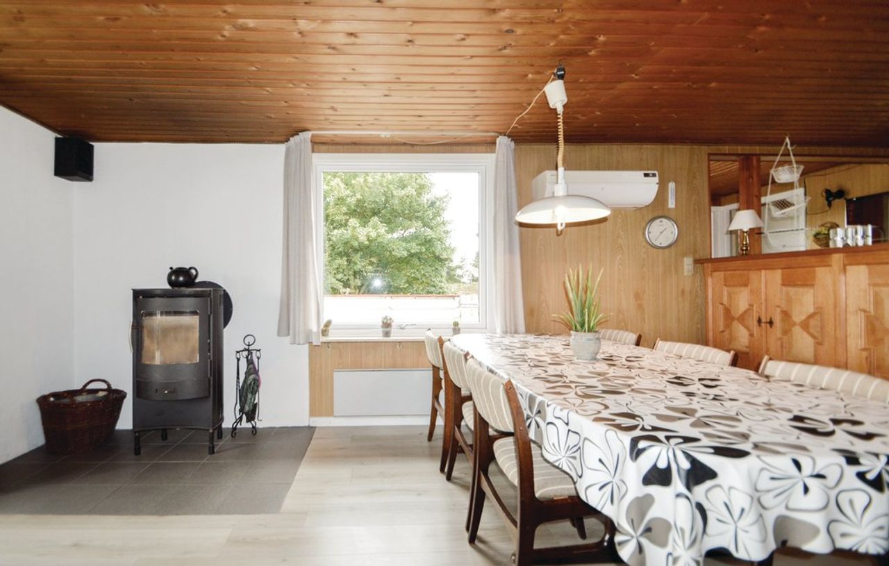 Huset er indrettet med åbent køkken, pragtfuld stor stue med spiseplads, brændeovn, varmepumpe og udgang til den overdækkede terrasse, badeværelse med vaskemaskine og sauna, 2 soveværelser med dobbeltsenge, 1 soveværelse med 2 fritstående senge.