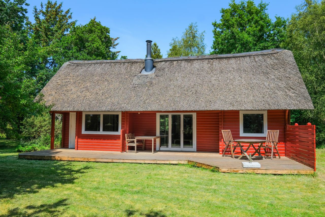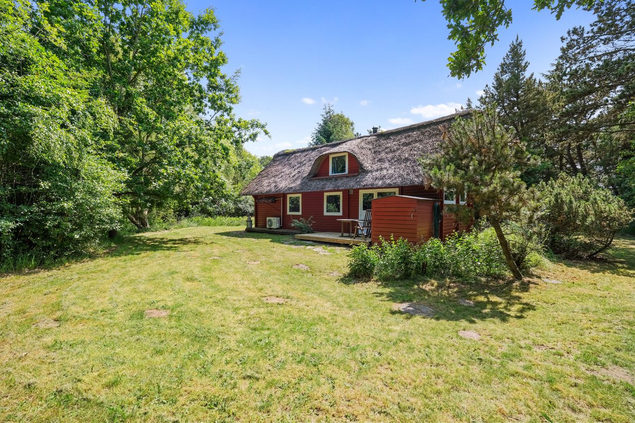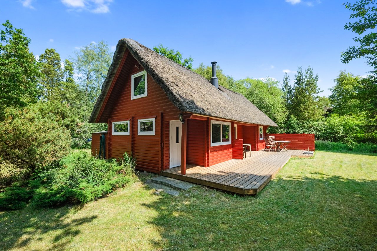 Pragtfuldt sommerhus med stråtag tæt på strand, indkøb, bager og Golfbane sælges. Huset bruges kun privat af sælger, udlejes ikke. Udsigt ud mod markarealer. Indlagt fibernet. Sommerhuset er opført i 1968/1990 i 2 plan, opvarmes ved elvarme, brændeovn og varmepumpe(kan tændes hjemmefra/fjernstyret), boligarealet udgør 70 m2, 50 m2 i stueplan og 20 m2 udnyttet tageetage. Pragtfuldt stort grundstykke på hele 3.013 m2, omgivet af træer.