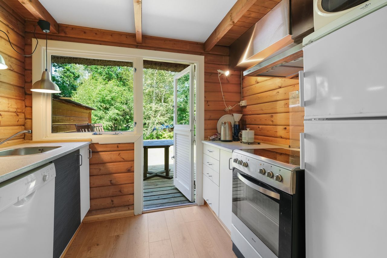 Husets indretning: Entr'e, åbent køkken-stue-miljø med spisekrog og opvaskemaskine, hyggelig stue med brædeovn og varmpepumpe samt adgang til vestvendt terrasse, badeværelse med bruseniche, 1 soveværelse med dobbeltseng, via stue er der adgang til den udnyttede tageetage, hvor der forefindes 2 store soveværelser med dobbeltsenge