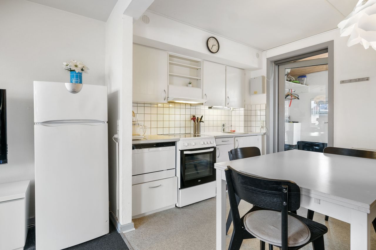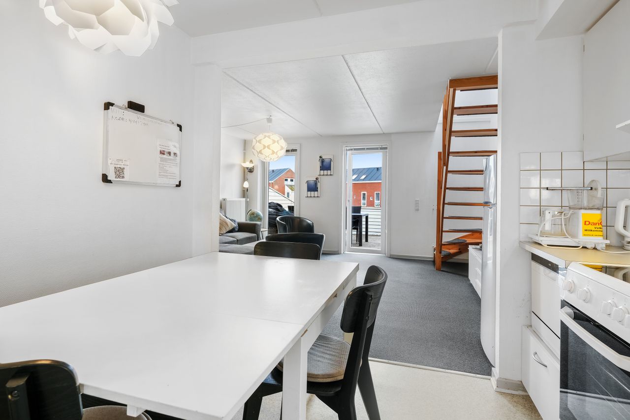 Lejligheden er i stueetagen indrettet med vindfang, flot stort køkken-stue-miljø med udgang til den store terrasse, 1 soveværelse med køjesenge, via stuen er der adgang til den udnyttede tagetage, hvor der forefindes et badeværelse med bruseniche samt 2 soveværelser med dobbeltsenge.