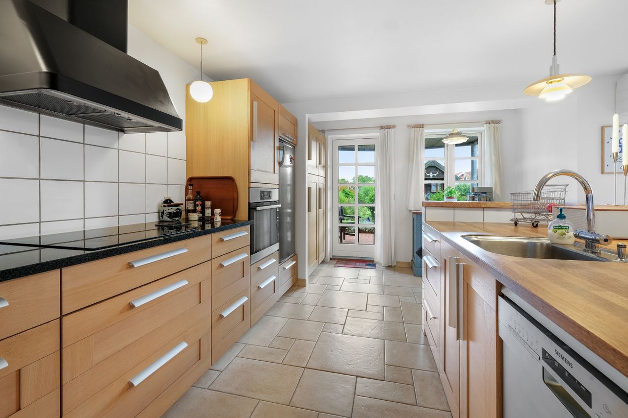 Huset er indrettet med et bryggers, nydeligt og stort køkken/alrum med udgang til terrassen, stort badeværelse, fra alrum adgang til den udnyttede tagetage, hvor der forefindes stor stue med brændeovn samt udgang til balkon med flot udsigt, 1 soveværelse, 2 børneværelser og et gæste-toilet.