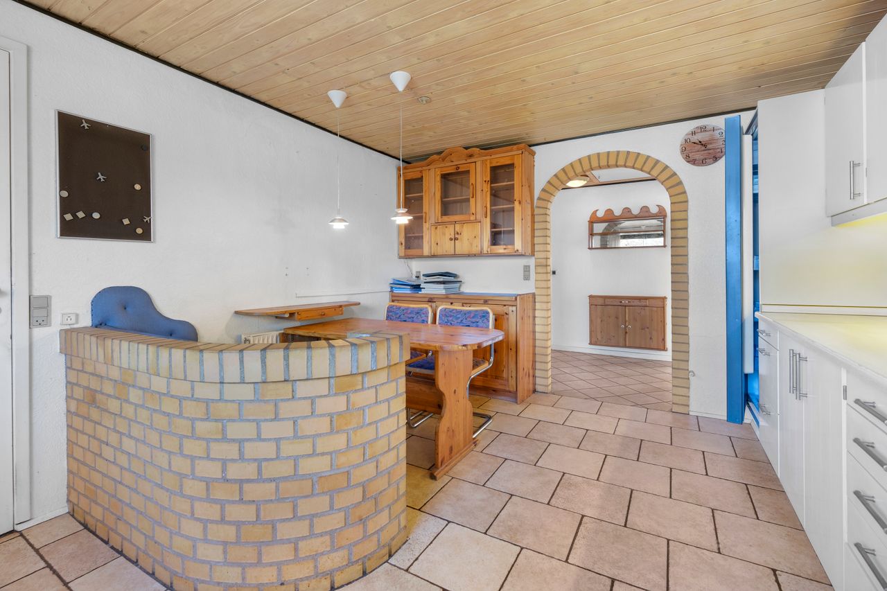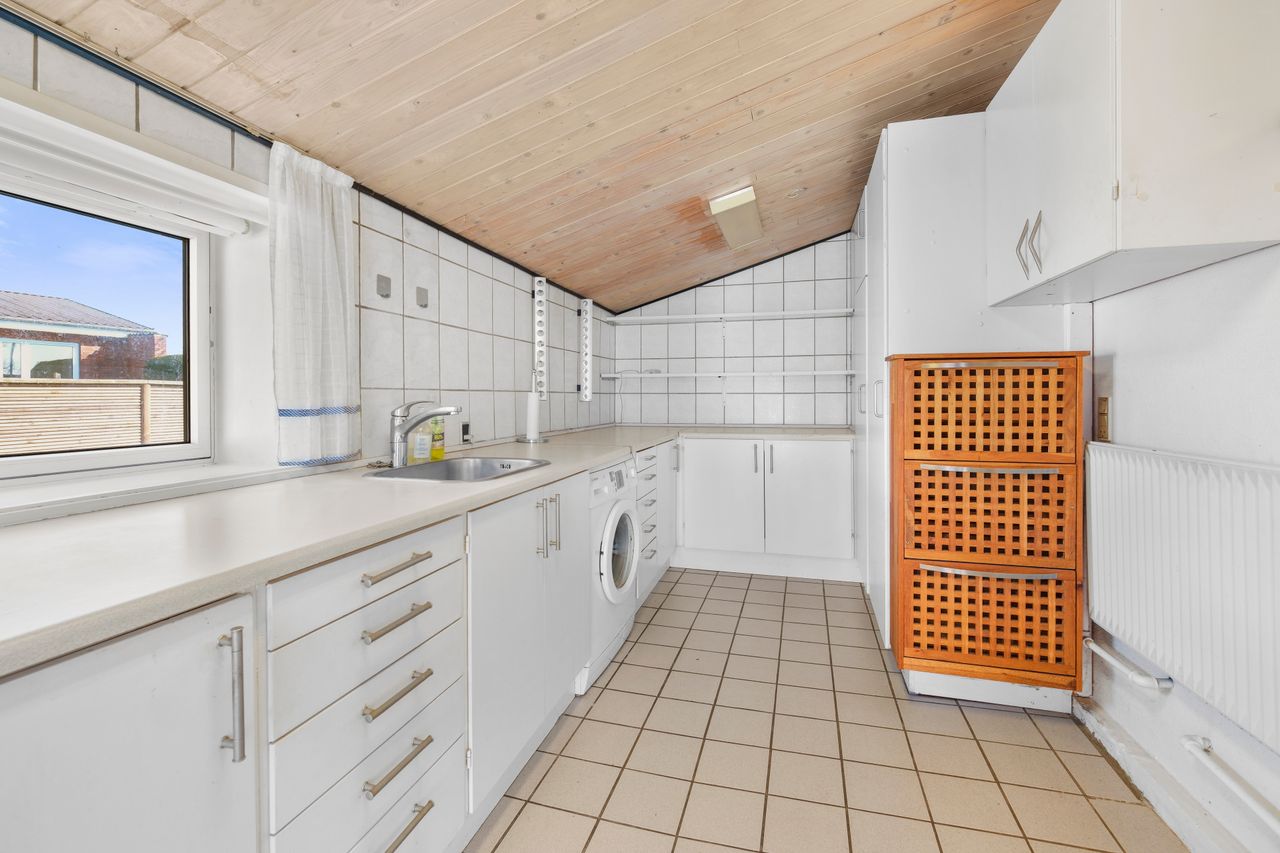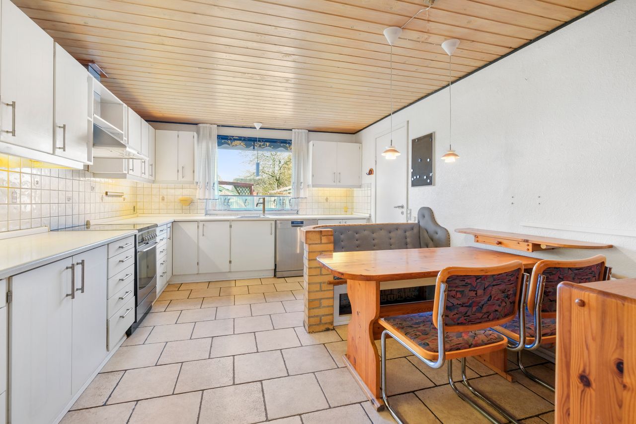 Huset er indrettet med entre', bryggers med plads til vaskemaskine og tørretumbler, nydeligt køkken med opvaskemaskine, flot badeværelse med gulvvarme, stor stue med udgang til terrassen, 1 stort soveværelse med skabe samt et stor børneværelse