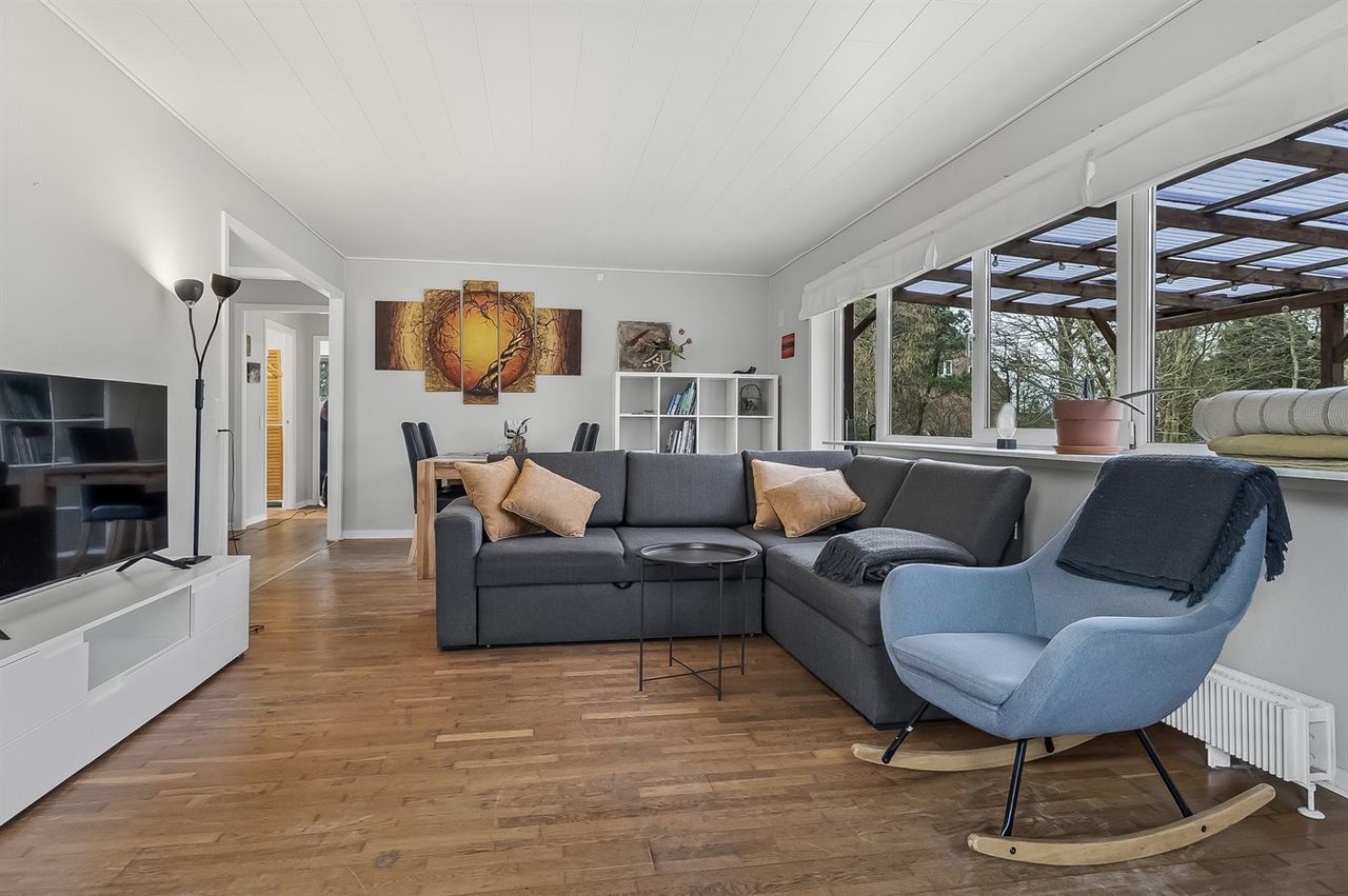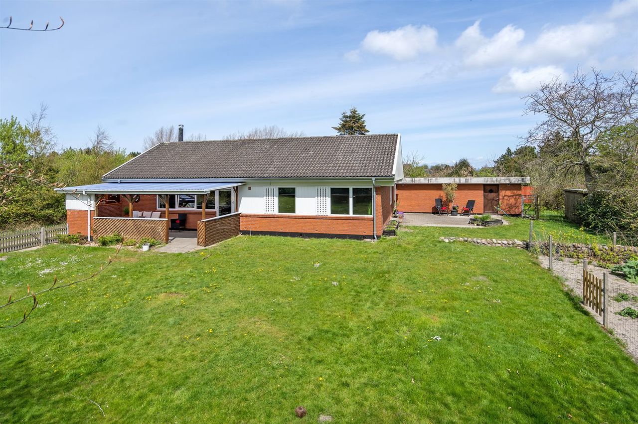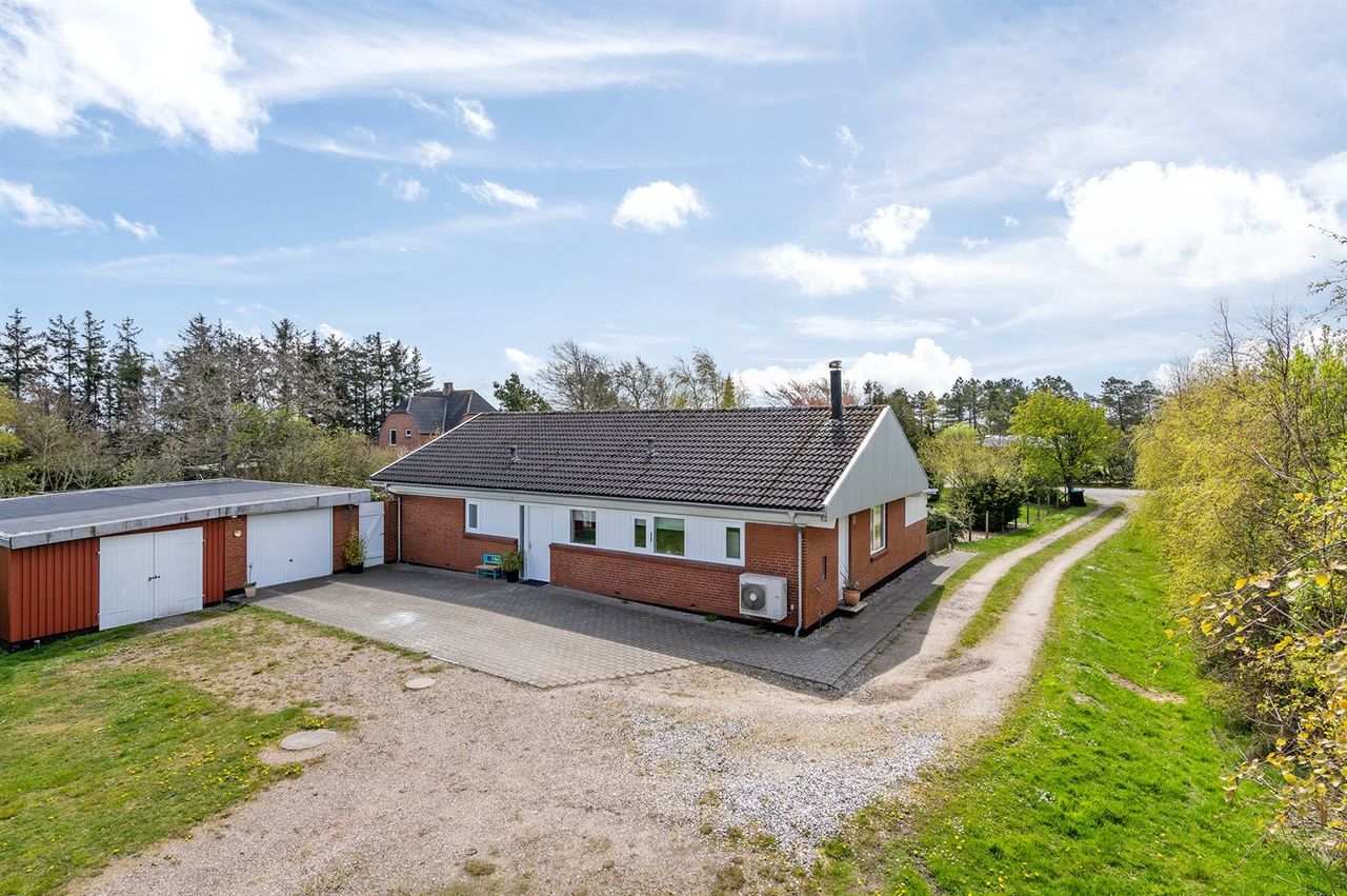 Husets indretning består af 116 kvadratmeter fordelt på en rummelig stue, med plads til både spiseplads og hyggekrog. Et fint køkken, der ligger i åben forbindelse med stuen og gangen. Fint badeværelse, samt et stort soveværelse. Et soveværelse med egen udgang til den ene terrasse, samt et praktisk bryggers. På ejendommen er der også både carport(22 m2) og garage(32 m2), samt et stort isoleret værksted, hvor der er god mulighed for at lave dette om til aktivitetsrum el. lignende. Særdeles gode og anvendelige bygninger. Huset er opvarmet med en luft til vand pumpe fra 2017. Energimærket B.